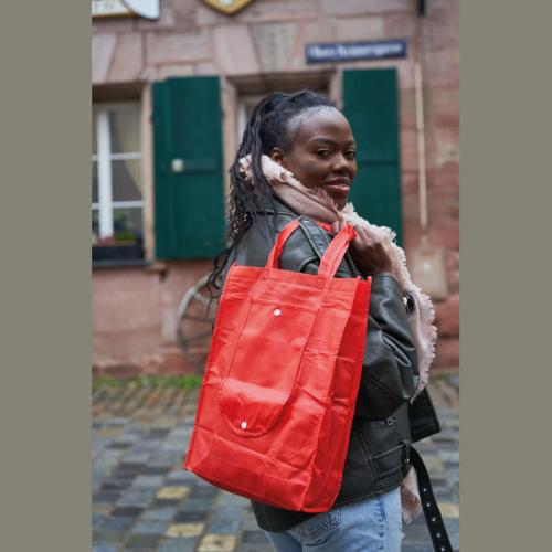 The non-woven shopping bag can be folded saving space, and stored anywhere, thus, it is always at hand for spontaneous shopping trips. We will print your logo on one side.
