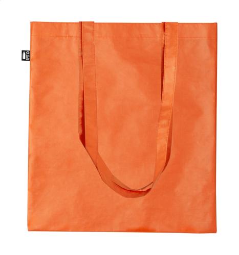Laminated RPET shopping bag with long handles, RPET polyester 100 g/m². With distinctive RPET label.