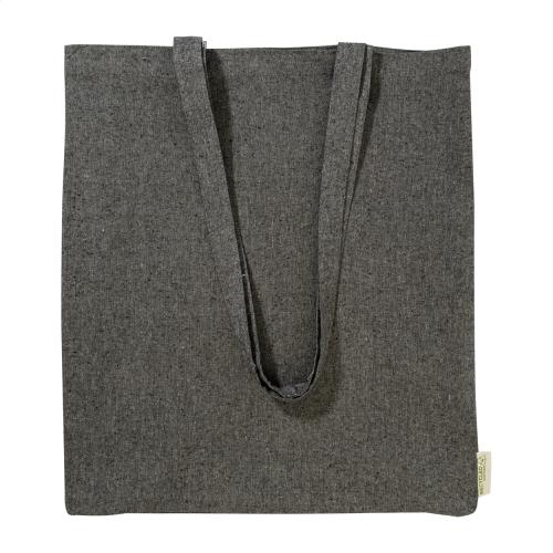 Reusable, recycled cotton shopping bag with long handles and distinctive recycled cotton label. 100% recycled cotton, 140 g/m².