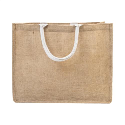 Laminated jute beach bag with cotton handles and front pocket.