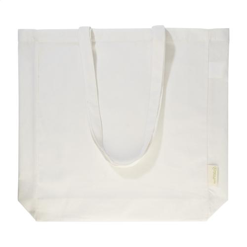 Shopping bag with gusset and long handles in 70% recycled cotton and 30% RPET polyester, 140 g/m². With distinctive recycled cotton label.