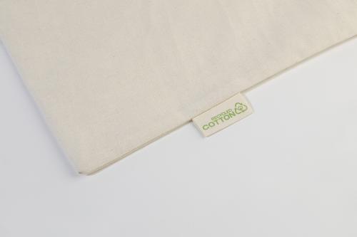 Shopping bag with long handles in 70% recycled cotton and 30% RPET polyester, 140 g/m². With distinctive recycled cotton label.