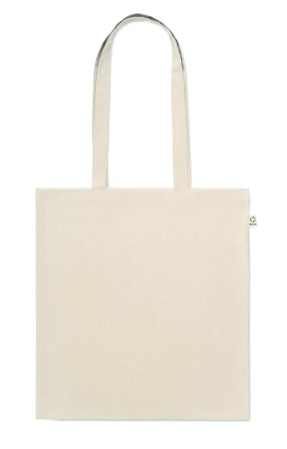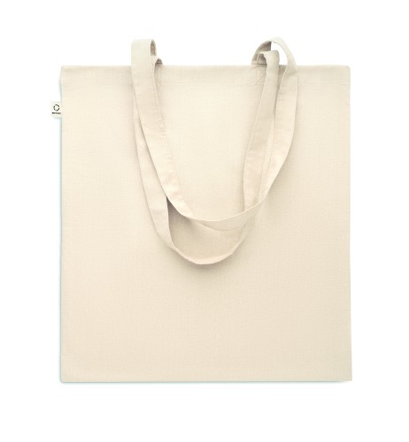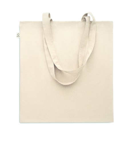 Recycled pre-consumer cotton shopping bag (70% recycled cotton and 30% RPET) with long handles. 140 gr/m². This item can shrink after printing.