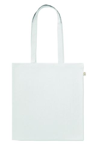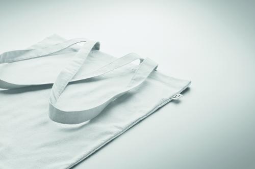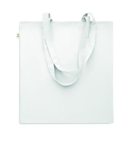 Recycled pre-consumer cotton shopping bag (70% recycled cotton and 30% RPET) with long handles. 140 gr/m². This item can shrink after printing.