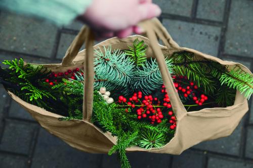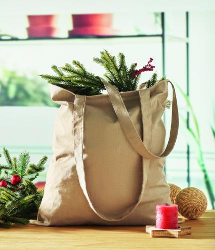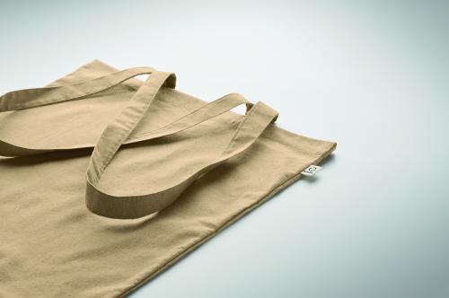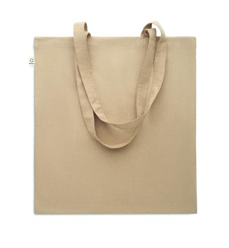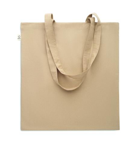 Recycled pre-consumer cotton shopping bag (70% recycled cotton and 30% RPET) with long handles. 140 gr/m². This item can shrink after printing.