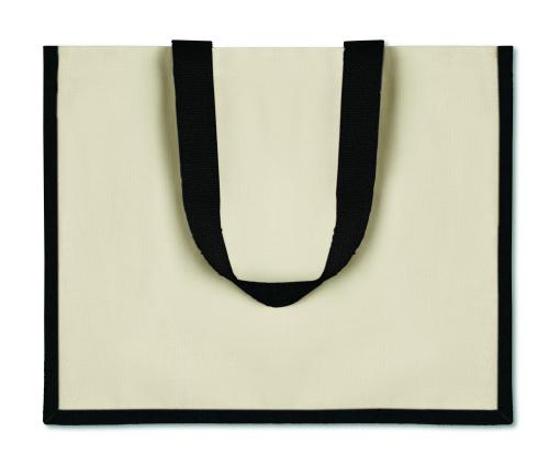 Shopping bag made of laminated jute with front in canvas and cotton webbing. Long handles.