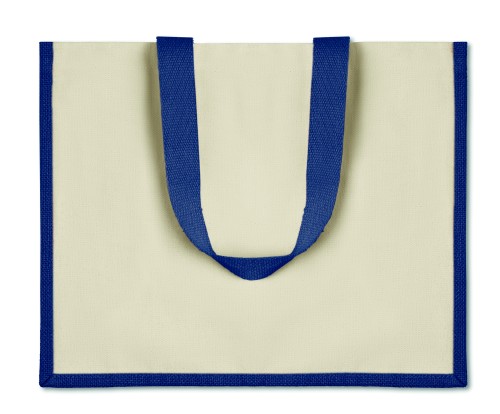 Shopping bag made of laminated jute with front in canvas and cotton webbing. Long handles.