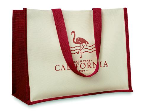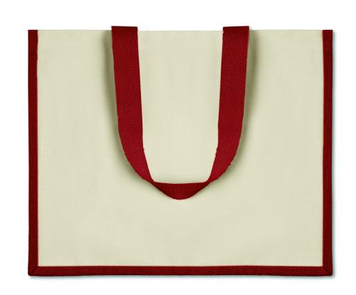 Shopping bag made of laminated jute with front in canvas and cotton webbing. Long handles.