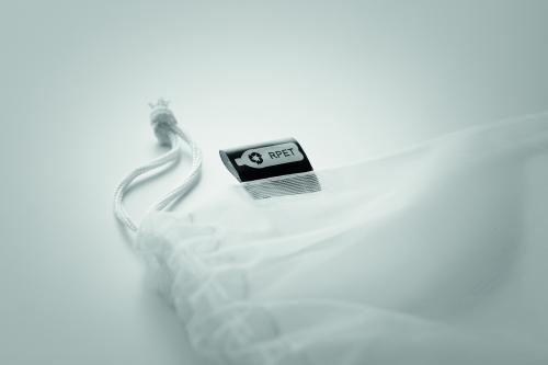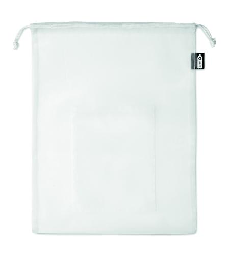 Food bag in mesh RPET with front pocket and white PP drawstring cord on top.