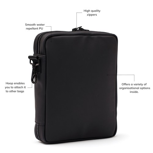 Keep all essentials near at hand with this handy organiser. This gives you a space for everything you need during a day, such as headphones, power bank, pens and notebooks. The snap hook on the short side allows you to attach the bag to a larger bag.