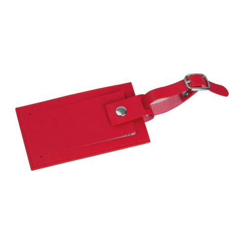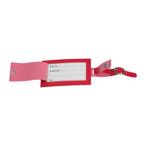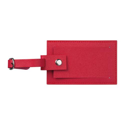 Luggage tag made of water-repellent PU material, belt loop for fastening and address field window that can be closed with a press stud.