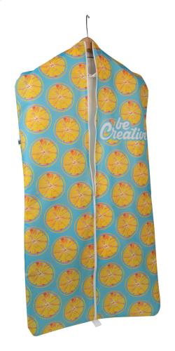 Custom made, zipped garment bag in 190T RPET polyester. With all over sublimation printed graphics and distinctive RPET label. MOQ: 25 pcs.