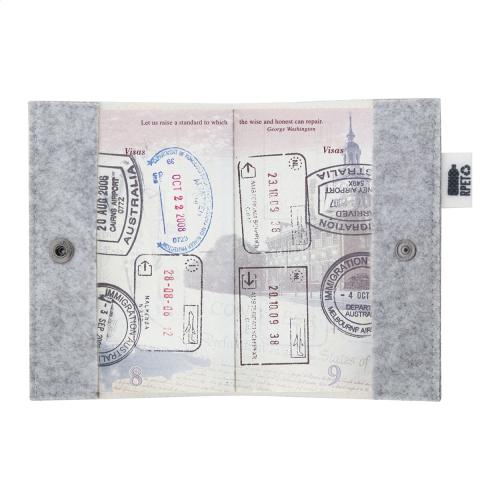 Custom made, RPET felt passport case with full colour printed cover and press-stud closure. With distinctive RPET label. Price includes sublimation printing. MOQ: 50 pcs.