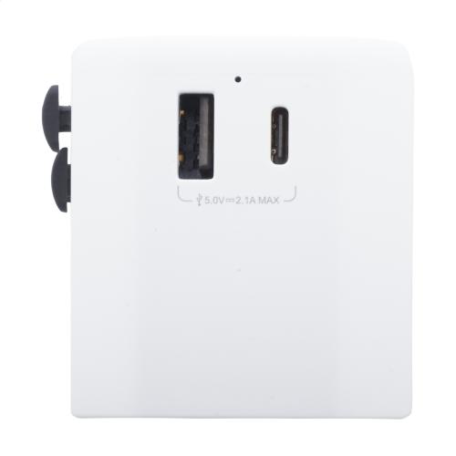 Universal world-wide travel adapter in ABS plastic, with built-in wall plugs for USA, Europe, UK and Australia. With 1 USB and 1 USB-C charger ports.
