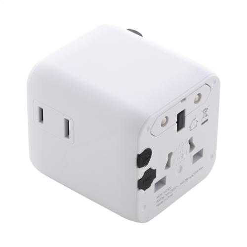Ultra compact, universal world-wide travel adapter in recycled PC plastic, with built-in wall plugs for USA, Europe, UK and Australia.