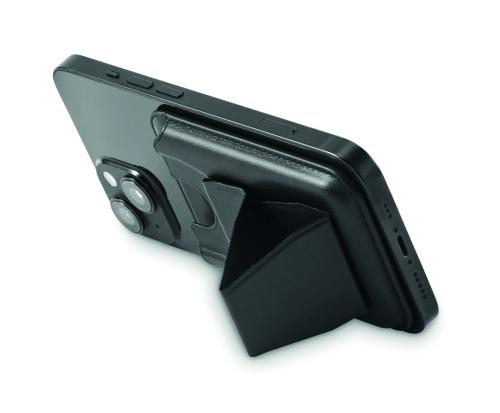 PU leather phone cardholder (for 2 cards) with stand function and magnetic closure. Compatible with iPhone® 12 and newer. Including magnetic metal ring to support charging of other non-magnetic wireless chargeable phones.