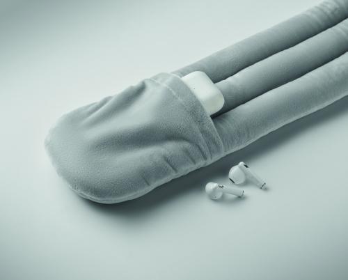 Bendable travel pillow made of soft polyester and foam. Includes RPET drawcord pouch for easy storage. Comfortable and compact for travel.