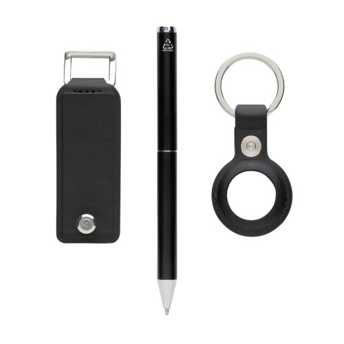 Swiss Peak Tula RCS certified key organiser, practical AirTag Holder and recycled aluminium Pen. Crafted for efficiency and style, the key organiser keeps your keys in check (for max 4 keys), while the AirTag Holder ensures you never lose track of your valuables. Plus, jot down your notes with the recycled aluminium pen. Elevate your everyday carry with this perfect set. Made with RCS (Recycled Claim Standard) certified recycled materials. RCS certification ensures a completely certified supply chain of the recycled materials. This product contains 7% RCS Certified Recycled PU and 8% RCS Certified Recycled Aluminium.