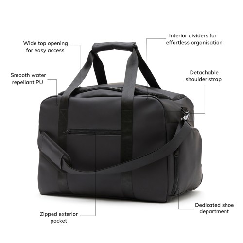 Stylish, minimalist gym bag made of a lightweight, water-resistant nubuck PU fabric with a chic matte exterior and a lightweight synthetic fabric interior. The main compartment closes with a zipper. Several interior compartments provide excellent organisational possibilities. The shoe compartment on the short side prevents shoes from soiling the bag's contents. Sturdy handles so you can fill the bag properly. Adjustable shoulder strap.
