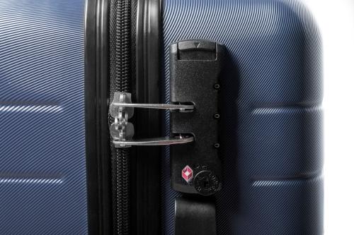 RPET plastic trolley bag with 4 double wheels, telescopic handle and TSA combination lock. With RPET inner lining and elastic fastening straps. With distinctive RPET sign.