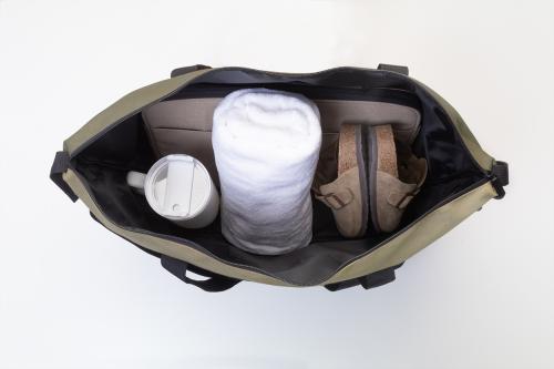 Recycled canvas travel / sports bag with zipped main compartment, front pocket, adjustable shoulder strap and zipped back pocket which doubles as trolley strap. 70% recycled cotton and 30% RPET polyester. With distinctive recycled cotton label.