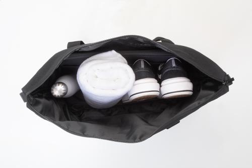 Recycled canvas travel / sports bag with zipped main compartment, front pocket, adjustable shoulder strap and zipped back pocket which doubles as trolley strap. 70% recycled cotton and 30% RPET polyester. With distinctive recycled cotton label.