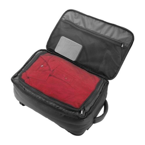 Schwarzwolf travel backpack in a black color. The backpack is interesting because it resembles a travel suitcase in composition and is suitable as carry-on luggage on a plane. It has an internal compartment that includes a large mesh pocket zipper and mesh pocket with zipper. The exterior of the backpack includes a front zippered pocket, a zippered pocket on the back of the backpack, and a strap to attach to the suitcase. The backpack has a padded back system and shoulder straps. Features a grab loop, two pull straps with plastic buckles on one side and two pull straps on the other side. Volume: 20 l. Weight: 703 g. Material: waterproof 900D PU reversed polyester, PE foam.