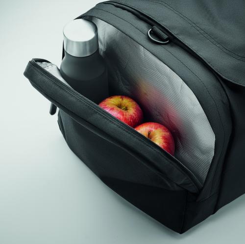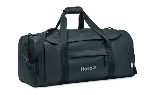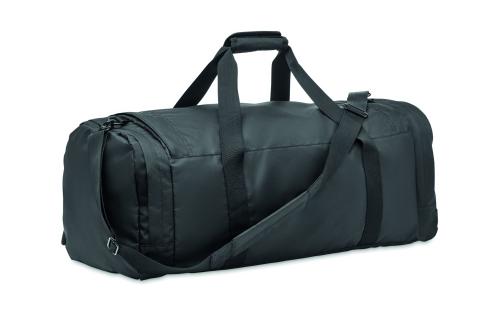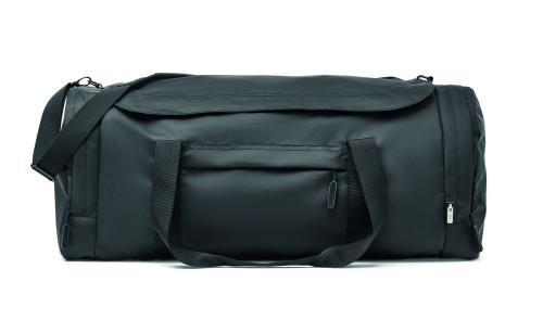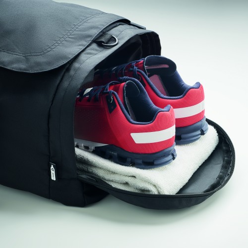 Large sports or travel bag in 300D RPET polyester. Main compartment with side zippered cooling and other compartments. Removable reinforcement bottom part and adjustable and detachable shoulder strap.