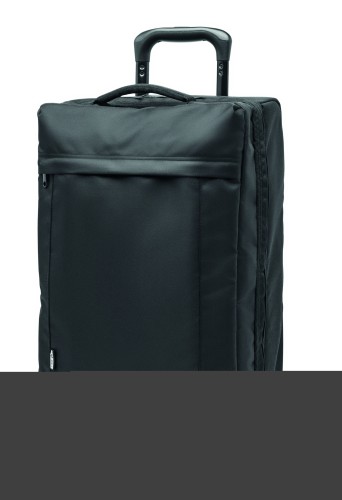 600D RPET polyester soft side trolley. Two large zippered inner compartments. One zippered front pocket and side and top handle. Including a combination lock and double tube frame. 2 wheels.