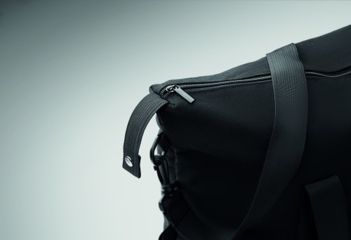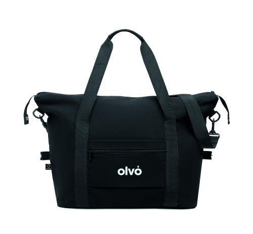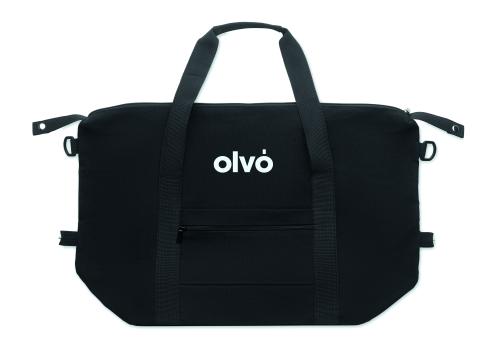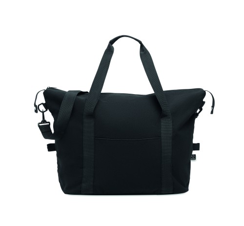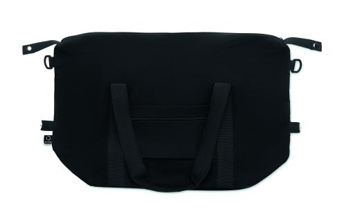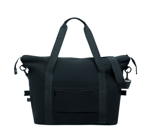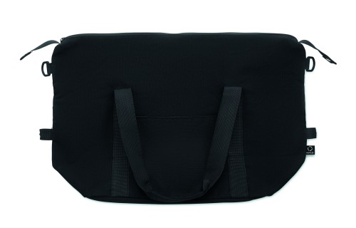 Weekend bag in recycled pre-consumer cotton and recycled polyester (70%/30%) with lining 210D RPET polyester. It has a front slip pocket, zippered back pocket a removable and adjustable shoulder strap and padded bottom. Trolley holder on reverse side.