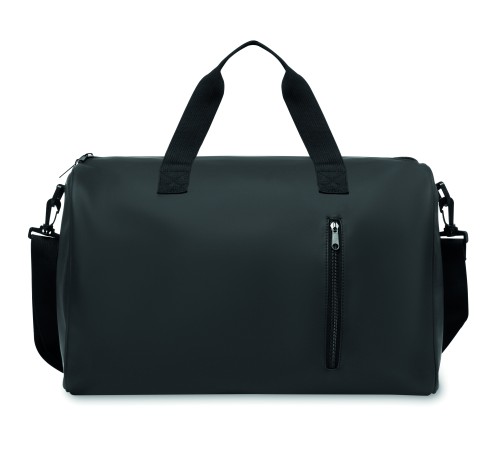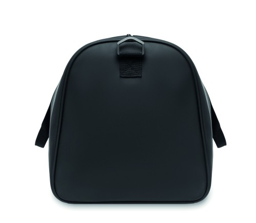 Duffle bag in soft PU with foam reinforcement to the base. One main compartment, zippered front pocket. 210D RPET polyester lining. 2 handles and one adjustable and detachable shoulder strap