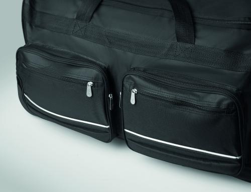 Soft duffle bag trolley in 600D RPET. Zippered front pocket. Two side slip pockets. Three inner pockets. Padded shoulder straps. 2 wheels and double tube frame.