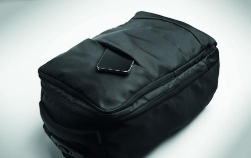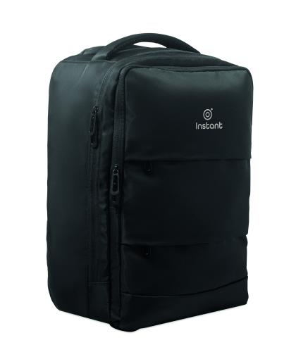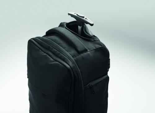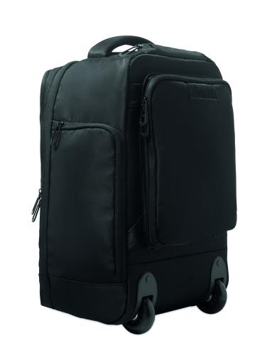 Backpack trolley in 290T RPET polyester with three front zip pockets, padded 15'' '' laptop compartment, and zippered cooling section. Features padded back, straps, and rear zip strap compartment.