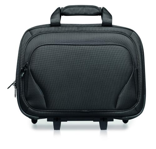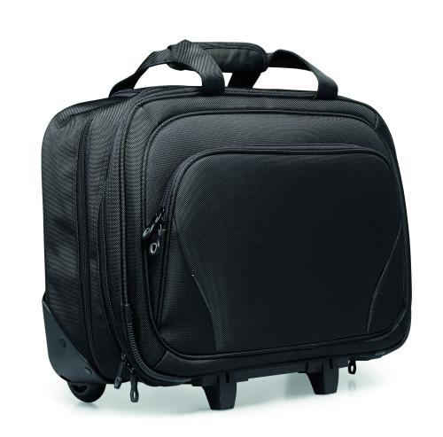 Business trolley including a 17 inch laptop pocket and 10 inch tablet pocket with several compartments. 1680D polyester.