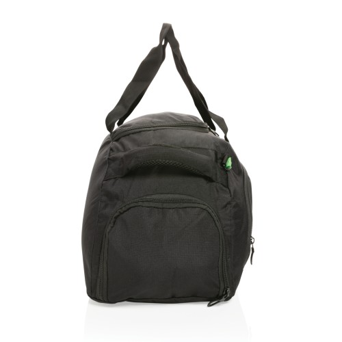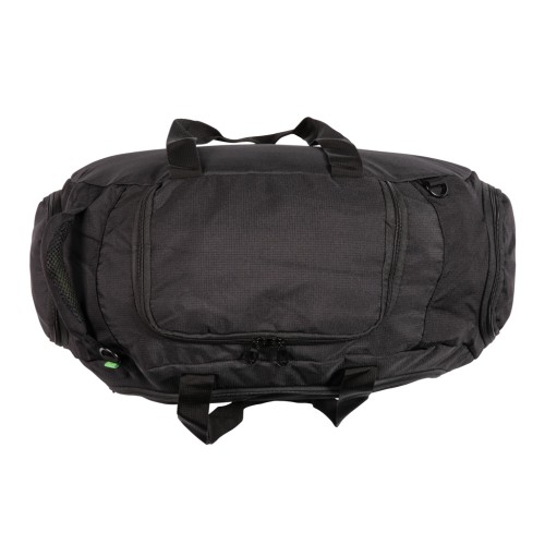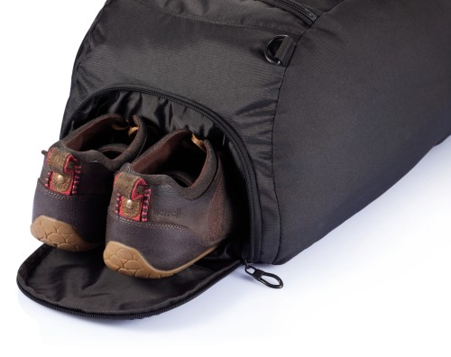 600D ripstop, zippered front pocket with organisers inside, side pocket, shoe pocket, webbing handles and shoulder strap, 4 stand feet on base, PVC free.