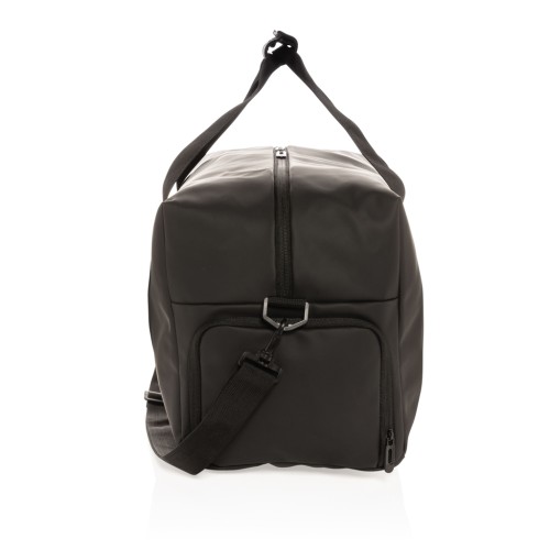 This weekend duffel made of smooth PU is suitable for daily trips to the gym as it is for a weekend getaway. It features a boxy minimalist design and has an external front pocket, inside pocket and a large main compartment. The bag has a convenient shoe compartment on the side. This bag can be worn over the shoulder or crosswise with the adjustable fabric carrying strap or carried by hand with the sturdy fabric handles. Exterior 100% PU. Interior 100% 210D polyester. PVC free.