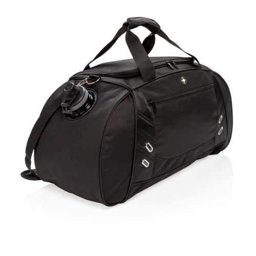 This 600D with 1680D polyester duffle bag offers sporty style for the gym or casual travel. Includes a roomy main compartment with a U-shaped top zipper closure, a side entry shoe compartment with air vent and a side bottle holder compartment. Front zippered quick-stash pocket for smartphones and other travel accessories. Adjustable shoulder strap and double top handles for carrying comfort and versatility. PVC free.