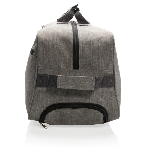 600D high density extra strong two tone polyester fabric. With extendable trolley system. One front pocket and one zipper closure main compartment.