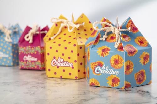 Custom made, full colour printed paperboard hexagonal gift box with string closure. Delivered flat-packed. MOQ: 50 pcs.