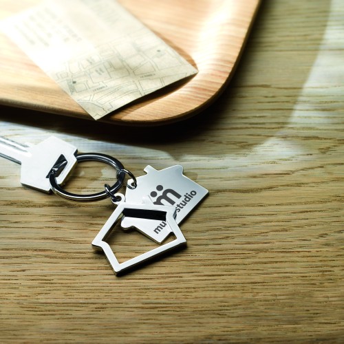 Metal key ring in house shape. Individually packed in a white carton gift box.