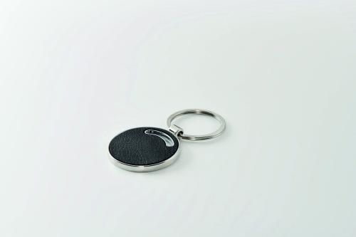 Round shaped metal key ring with recycled PU leather inlay.