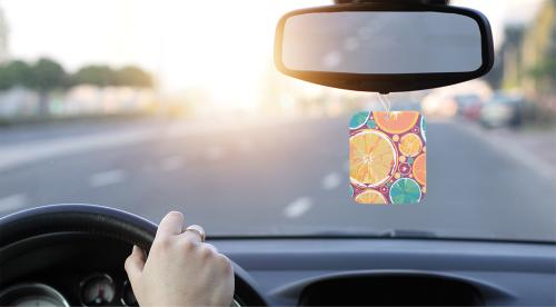 Car air freshener with custom fragrance (exotic, green apple, lemon, new car, ocean, vanilla, luxury, menthol). With full colour printing on both sides. MOQ: 250 pcs.