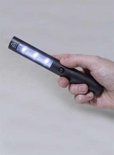 Recycled ABS emergency car flashlight with 3 LEDs and magnets on the back for hands-free use. Including button cell batteries.