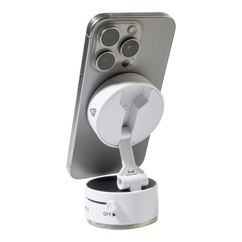Recycled ABS magnetic car mobile holder with vacuum suction fixture. Including self-adhesive metal ring for phones without a magnetic surface.