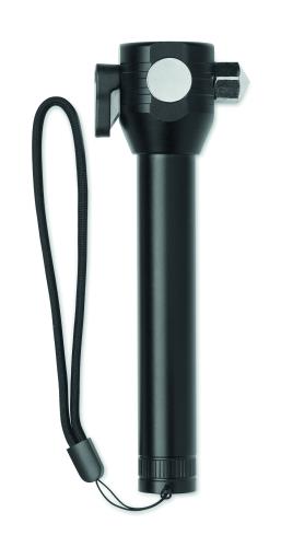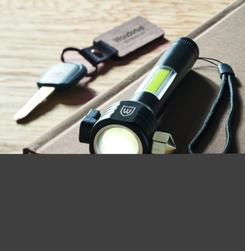 3 in 1 aluminium torch with emergency hammer and seat belt cutter. It has a COB light on side and front. Including magnet and hand strap. Built-in rechargeable 500mAh battery included.