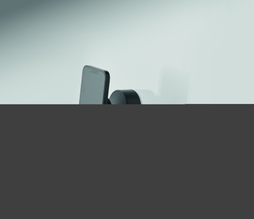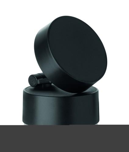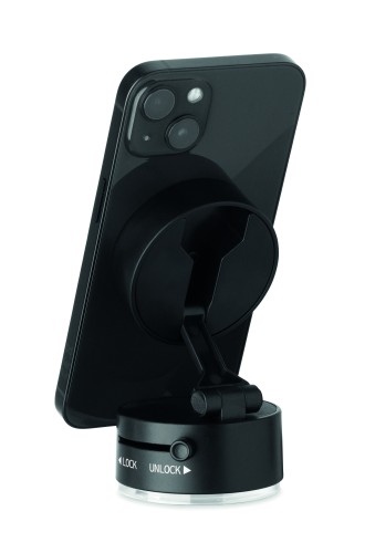 Magnetic phone holder in ABS. Vacuum suction hold. Compatible with iPhone® 12 and newer. Including additional magnetic metal ring to support charging of other non-magnetic wireless chargeable phones.