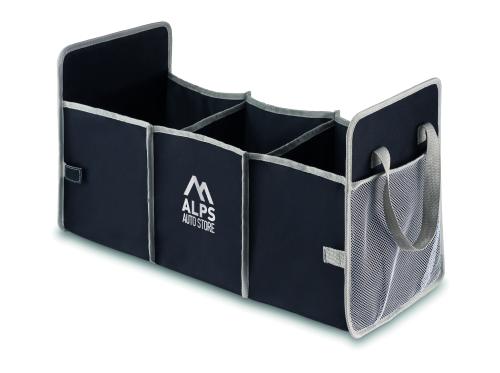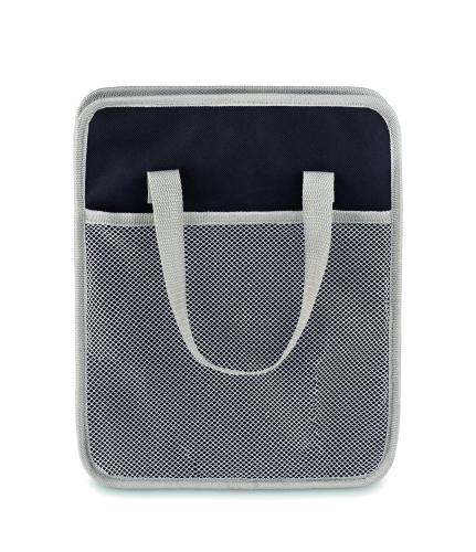 Foldable car organizer in 600D polyester with mesh pocket on side. When not in use, you can fold this up for compact storage. Also, this makes driving safer as it will prevent items from possibly rolling under the drivers feet.