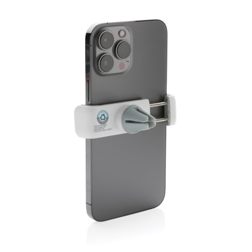 Universal and 360 degree rotatable car mount made with RCS (Recycled Claim Standard) certified recycled ABS. Total recycled content: 37% based on total item weight. RCS certification ensures a completely certified supply chain of the recycled materials. Simply click the item on your air vent and place your mobile phone (up to 6.2”) in the holder. Made out of heat resistant recycled ABS and strong silicone to make the item long lasting and prevent it from falling off your air vent while driving. With stainless steel mechanism inside to ensure your phone stays in place