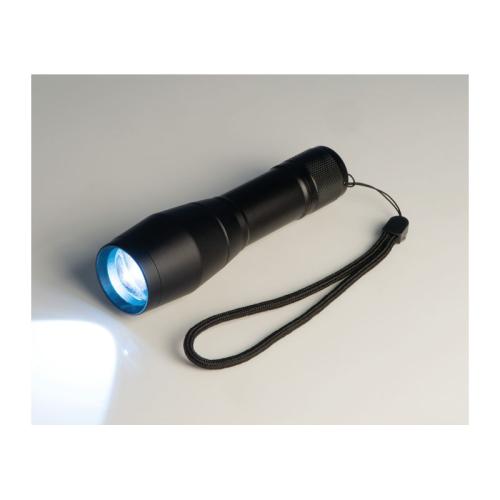 LED flashlight made of aluminium with 3 different light functions (still, SOS and flashing light), a power of 10 watts and a wrist strap.