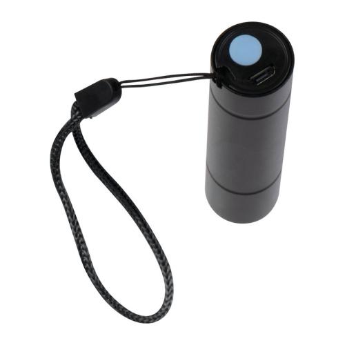 Rechargeable aluminum battery flashlight (400mAh) with three light modes: LED light front continuous and flashing and COB light side. A micro USB charging cable is included.